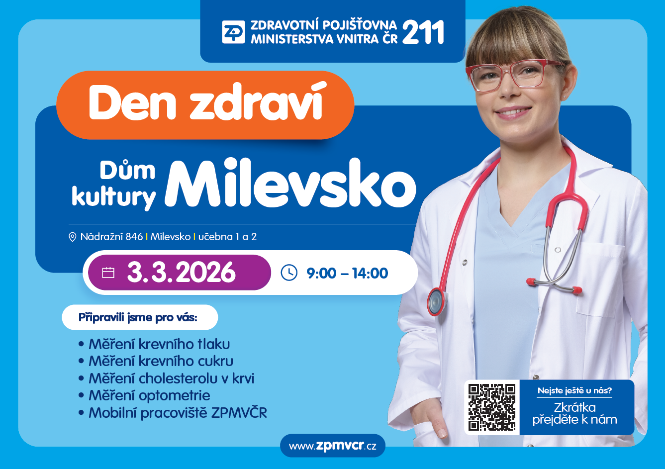 srdečně vás zveme na Den zdraví, který se uskuteční 3. března 2026 od 9.00 do 14.00 hodin v Domě kultury Milevsko (Nádražní 846, učebny 1 a 2). Přijďte si zdarma nechat změřit krevní tlak, hladinu cukru a cholesterolu v krvi nebo využít měření zraku. Na místě bude také mobilní pracoviště Zdravotní pojišťovny ministerstva vnitra ČR (211), kde získáte užitečné informace o prevenci i svém zdravotním pojištění.