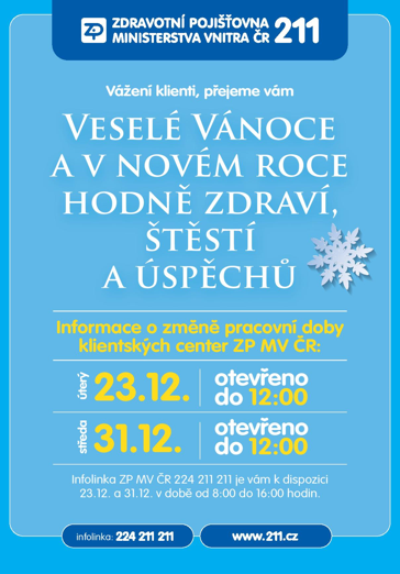 Upozorňujeme klienty, že ve dnech 23. 12. a 31. 12. budou naše klientská centra otevřena do 12:00 hodin. Také zákaznická linka bude v těchto dnech k dispozici ve zkráceném čase, a to od 8:00 do 16:00 hod.