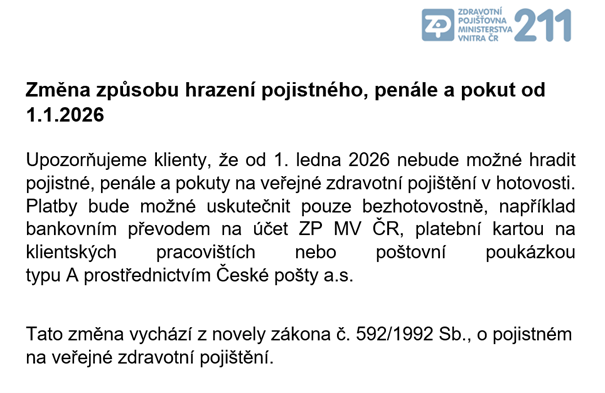 Upozorňujeme klienty, že od 1. ledna 2026 nebude možné hradit pojistné, penále a pokuty na veřejné zdravotní pojištění v hotovosti.